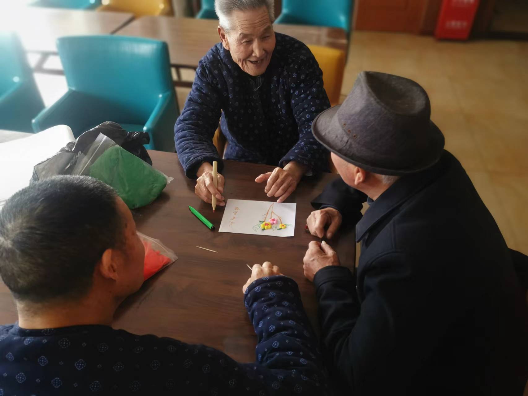 养老中心欢乐多,老年人们认真的做手工活动,制作她们喜欢的画作,一双巧手,捏出百味人生。