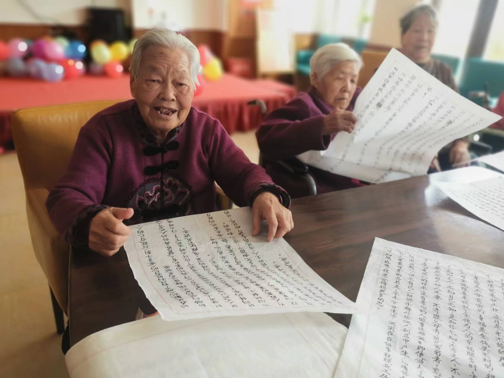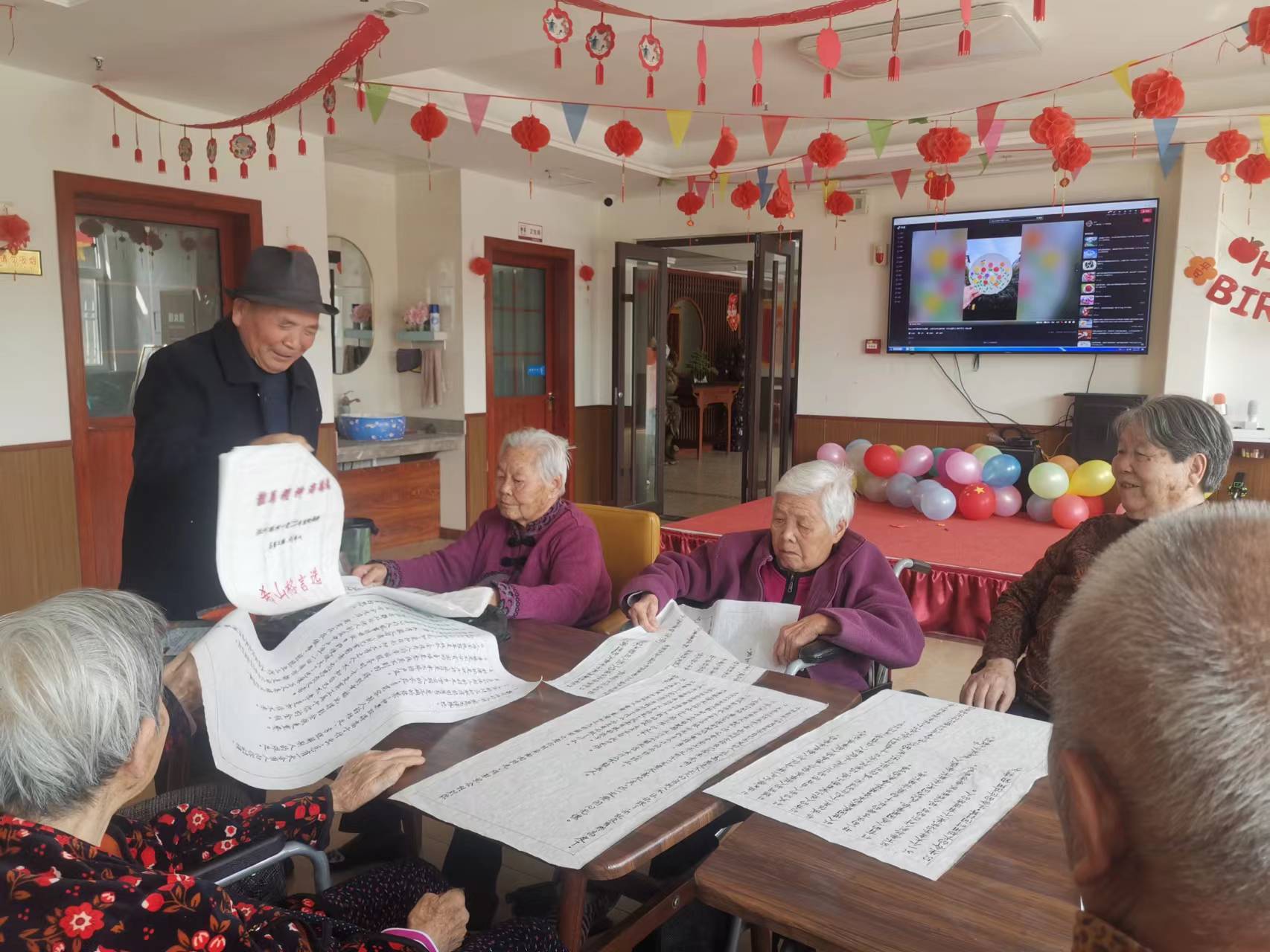 杨爷爷的书法写的工工整整,老人们一起欣赏着连连夸赞写得真好。