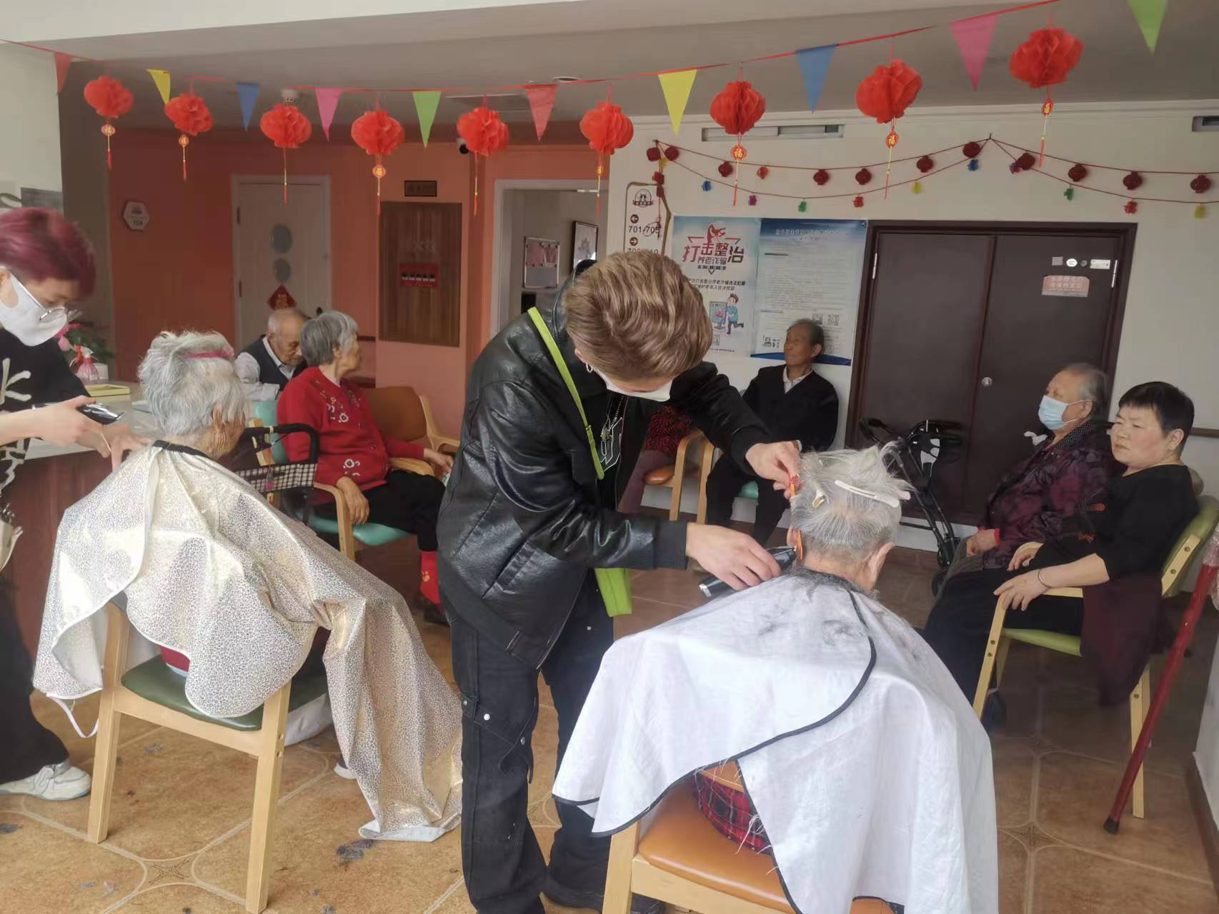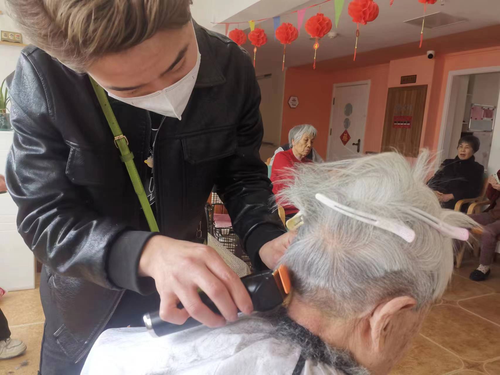 为老人们义务理发。理发时他们耐心询问老人的需求,贴心根据每位老人的相貌特点,设计出适合老人们的发型。